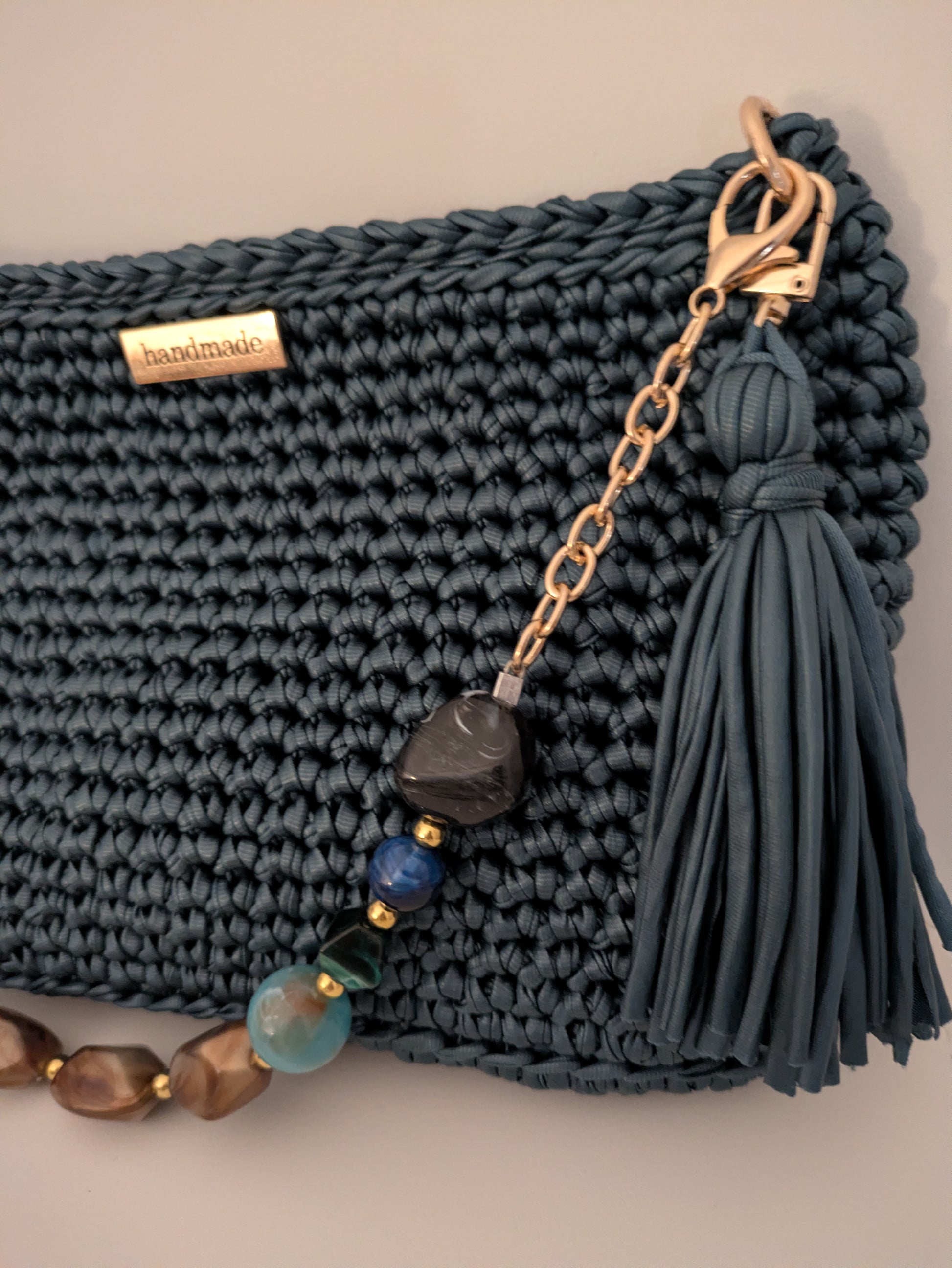 Realizzata in filato di ecopelle, con tracolla gioiello