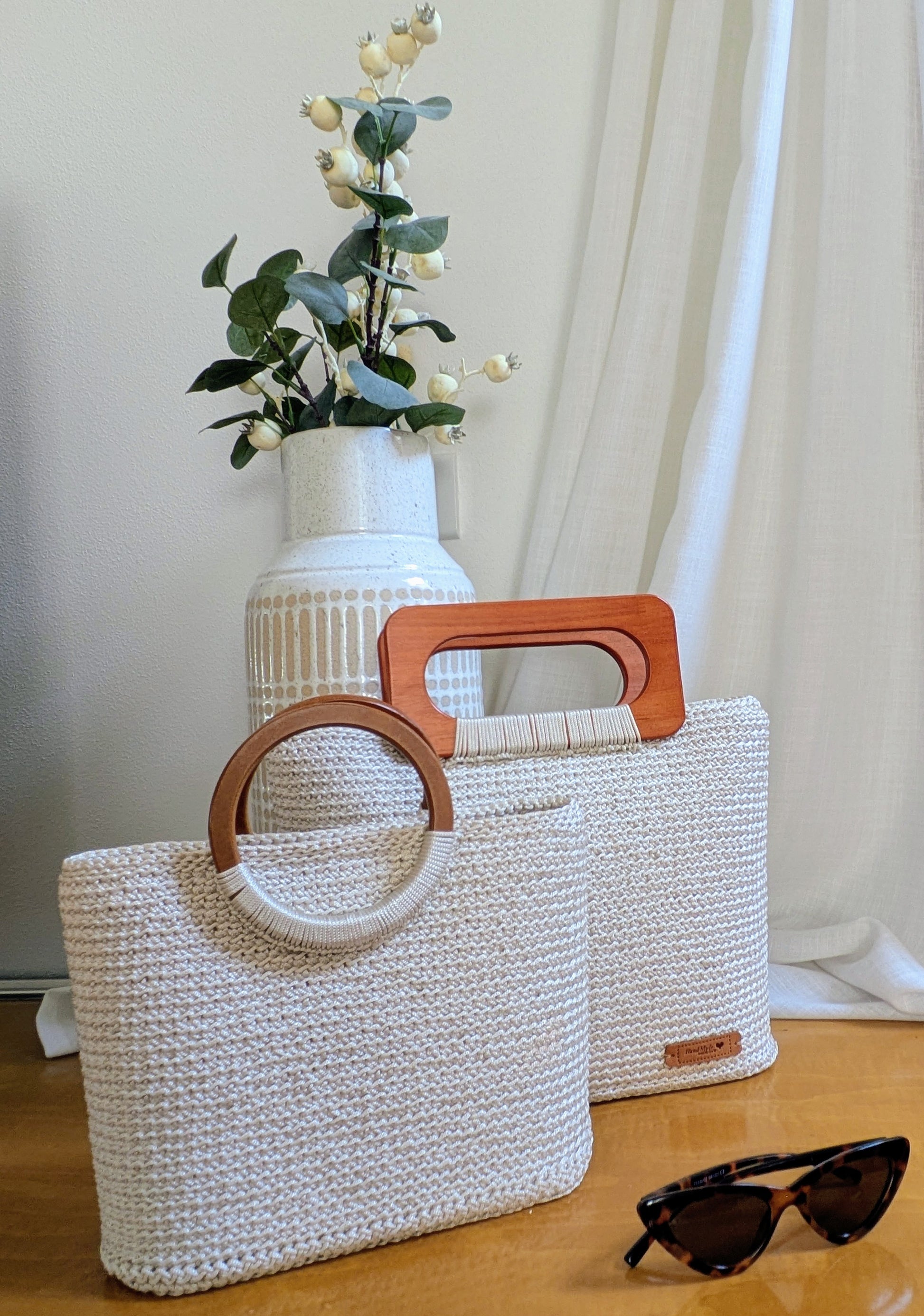 Realizzata con un filato per borse, con manici in legno, strutturata e foderata