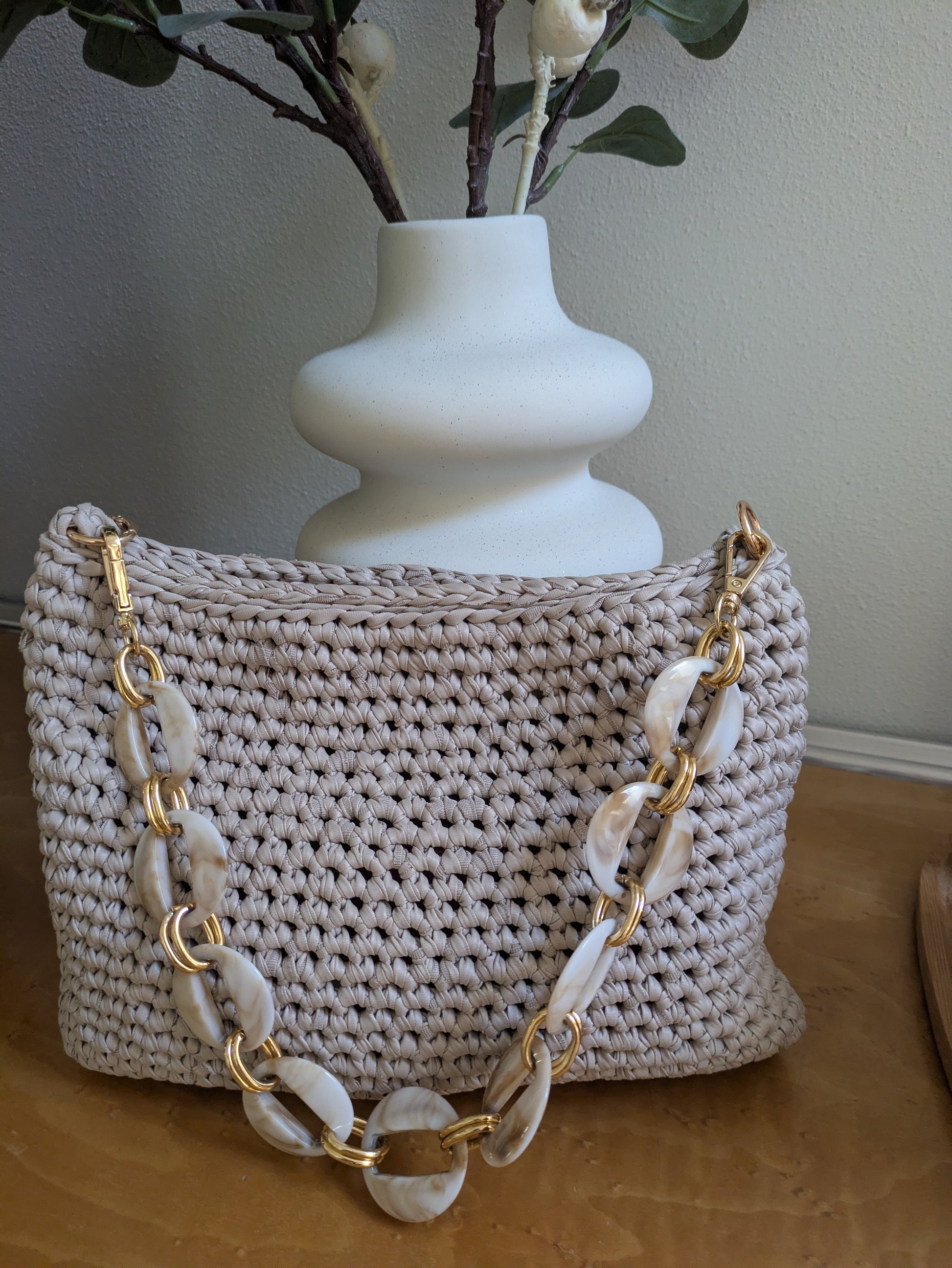 Borsa realizzata in ecopelle, con cerniera di chiusura e tracolla in resina