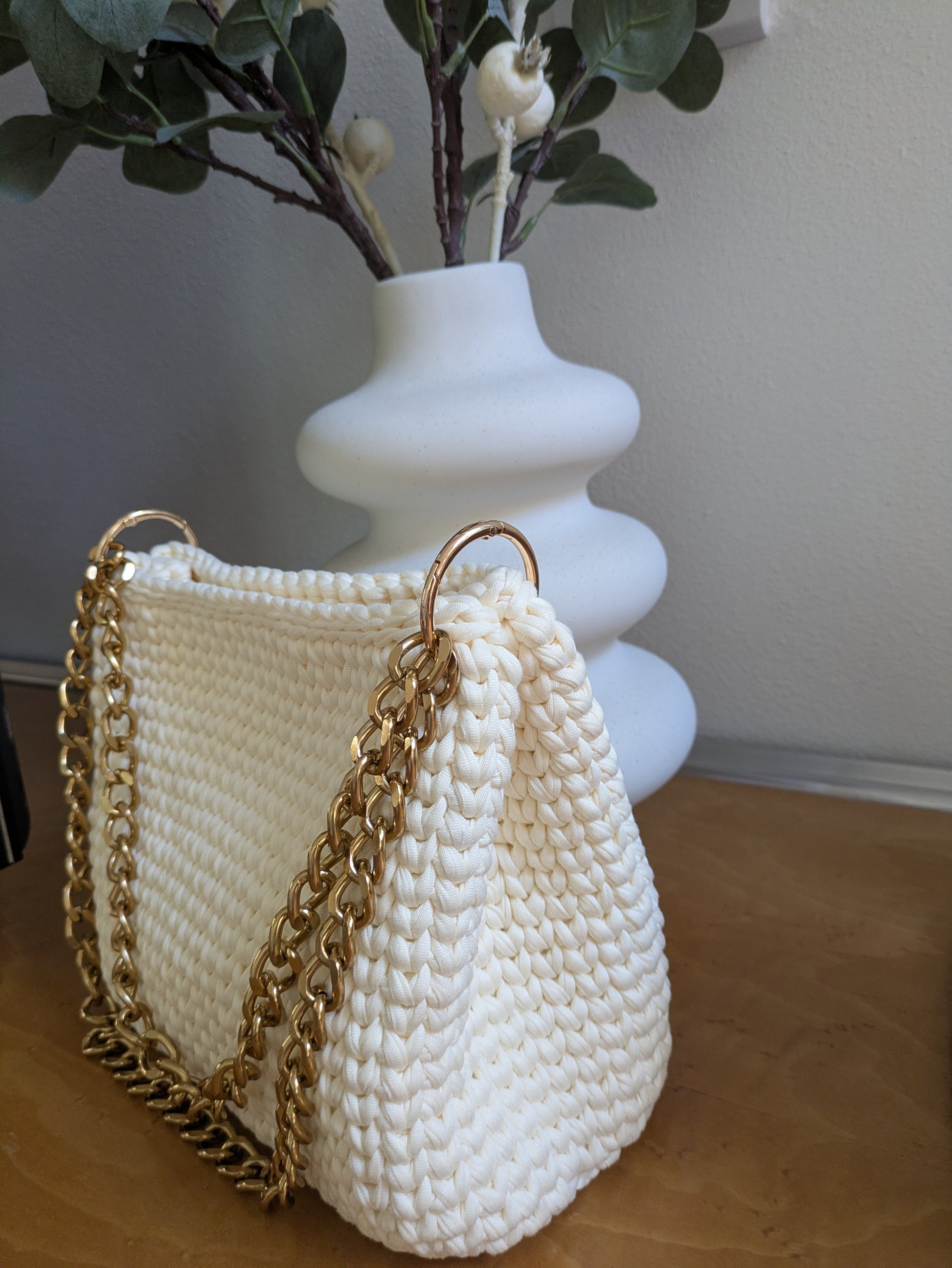 Realuzzata con fettuccia di lycra, fondo in ecopelle e tracolla in metallo