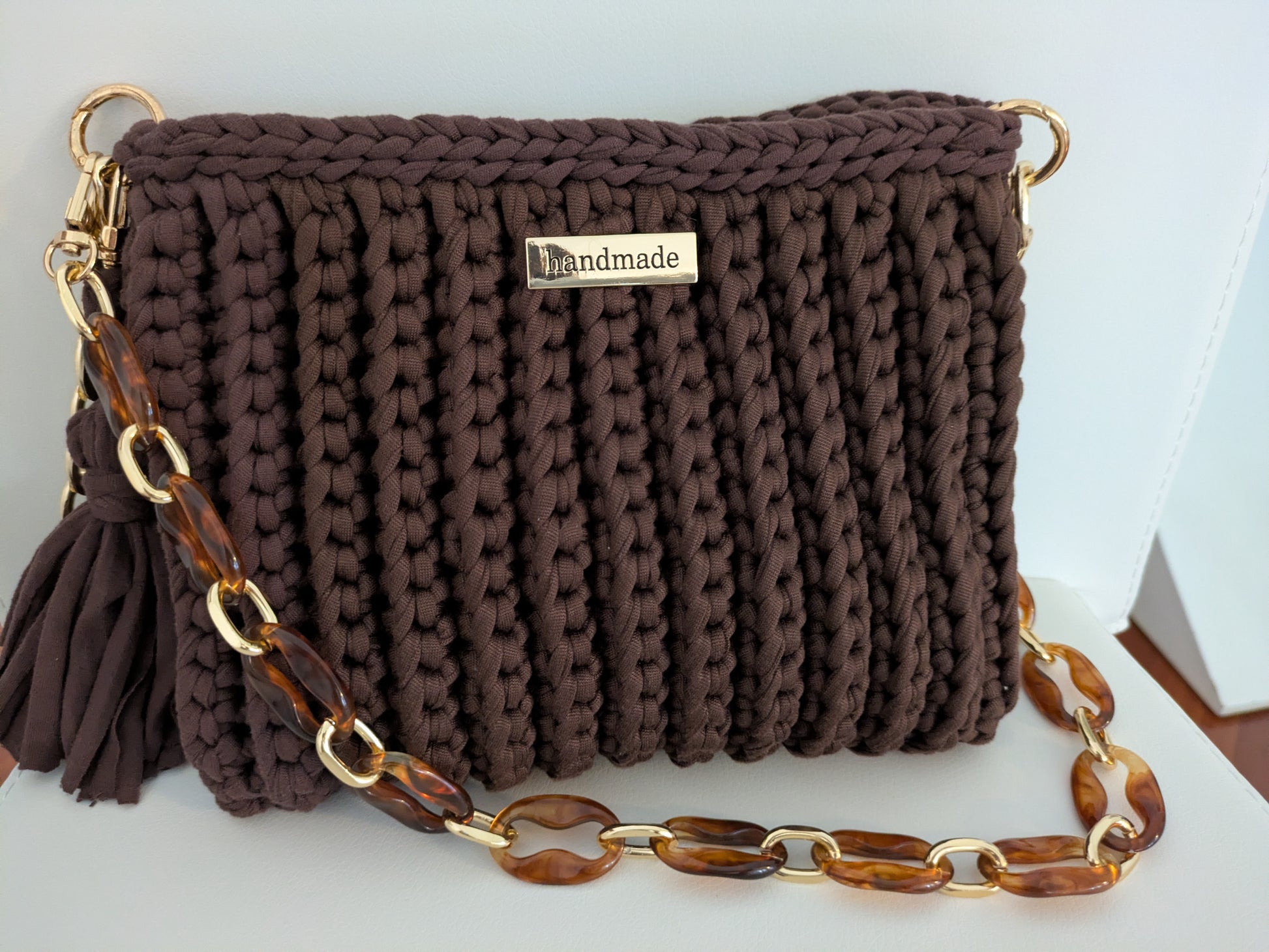 Borsa realizzata con fettuccia soft e tracolla in resina