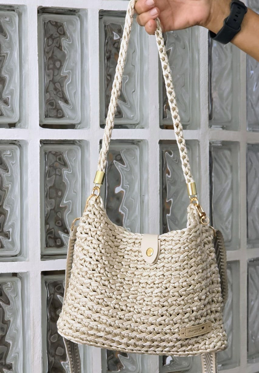 Realizzata con cordino per borse all'uncinetto, tracolla coordinata e chiusura in ecopelle